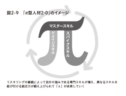 リスキリングによって「π型人材」になる。そして、リスキリングを継続することで「π型人材2.0」へと成長するのです。