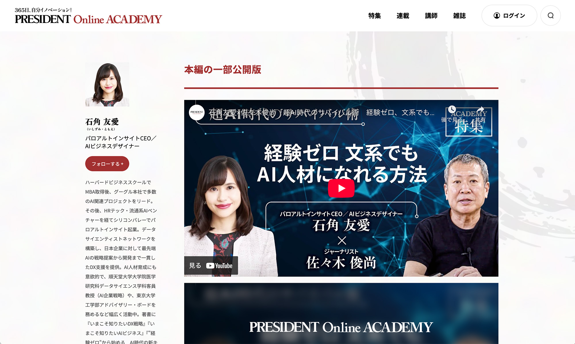 PRESIDENT Online ACADEMY(プレジデントオンラインアカデミー)にて、好評をいただいております弊社CEO石角友愛の「超AI時代のサバイバル術/経験ゼロ、文系でもAI人材になれる方法」がYouTubeで一部公開されております。
