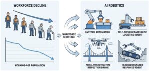 こうした状況の中で、AIとロボットを組み合わせて現場の作業を支えるAIロボティクスは、社会の「供給力」を維持する手段として期待されています。ここでは、日本社会が直面する課題と、AIロボティクスが果たす役割について見ていきます。